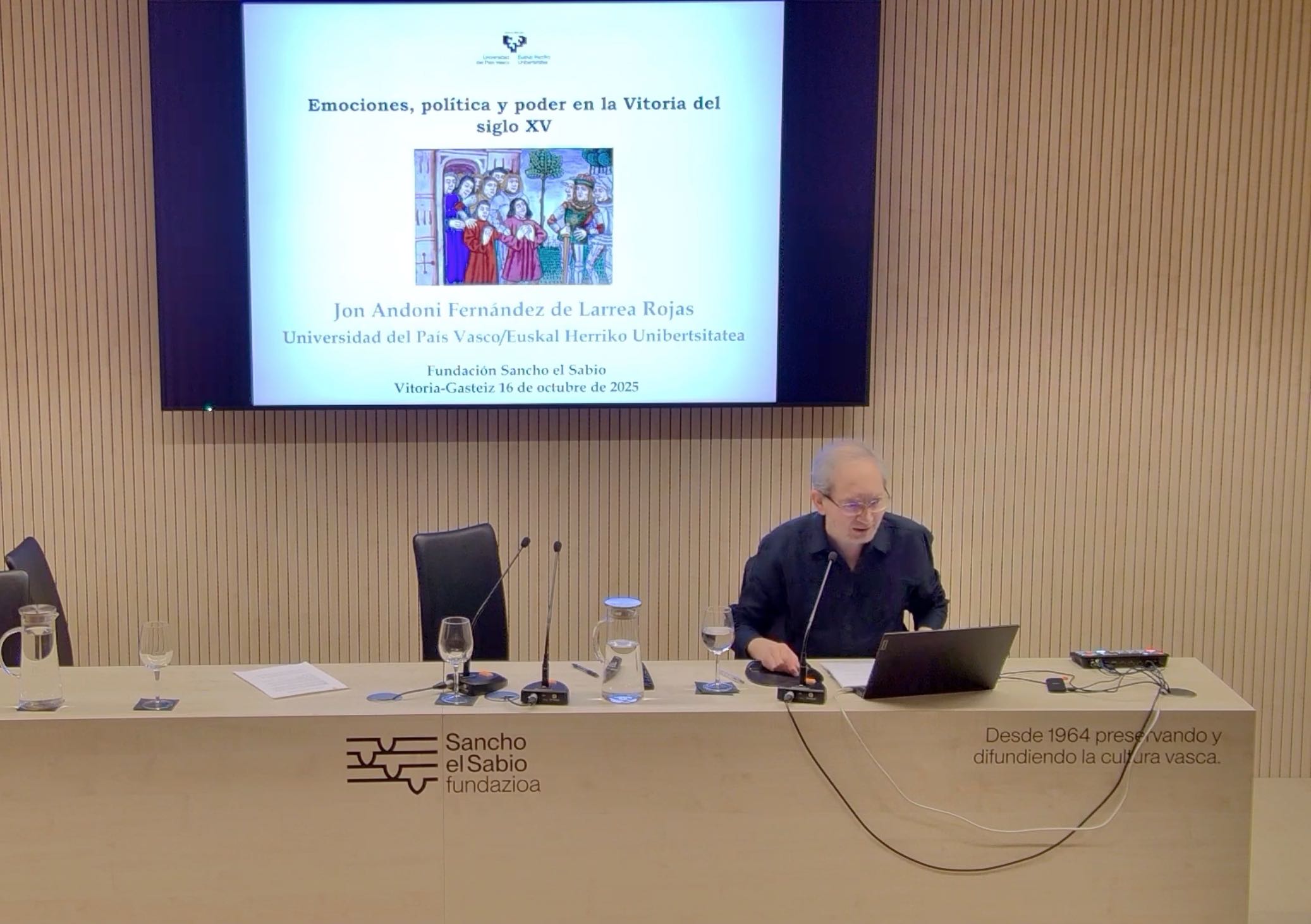 La Fundación Sancho el Sabio Fundazioa retomó el 16 de octubre su ciclo mensual de conferencias sobre la historia y la cultura alavesa, comenzando con la del segundo IP de nuestro proyecto, el doctor Jon Andoni Fernández de Larrea, quien impartió una charla titulada «Emociones, política y poder en la Vitoria del siglo XV», que ya está publicada en abierto.